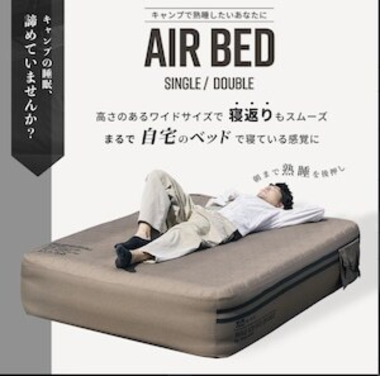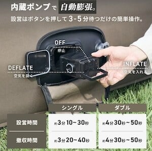 セット内容 ベッド本体/エアポンプ/エアポンプ用充電ケーブル(USB Type-C)/エアポンプ用先端ノズル/補修パッチ2枚/収納袋/取扱説明書